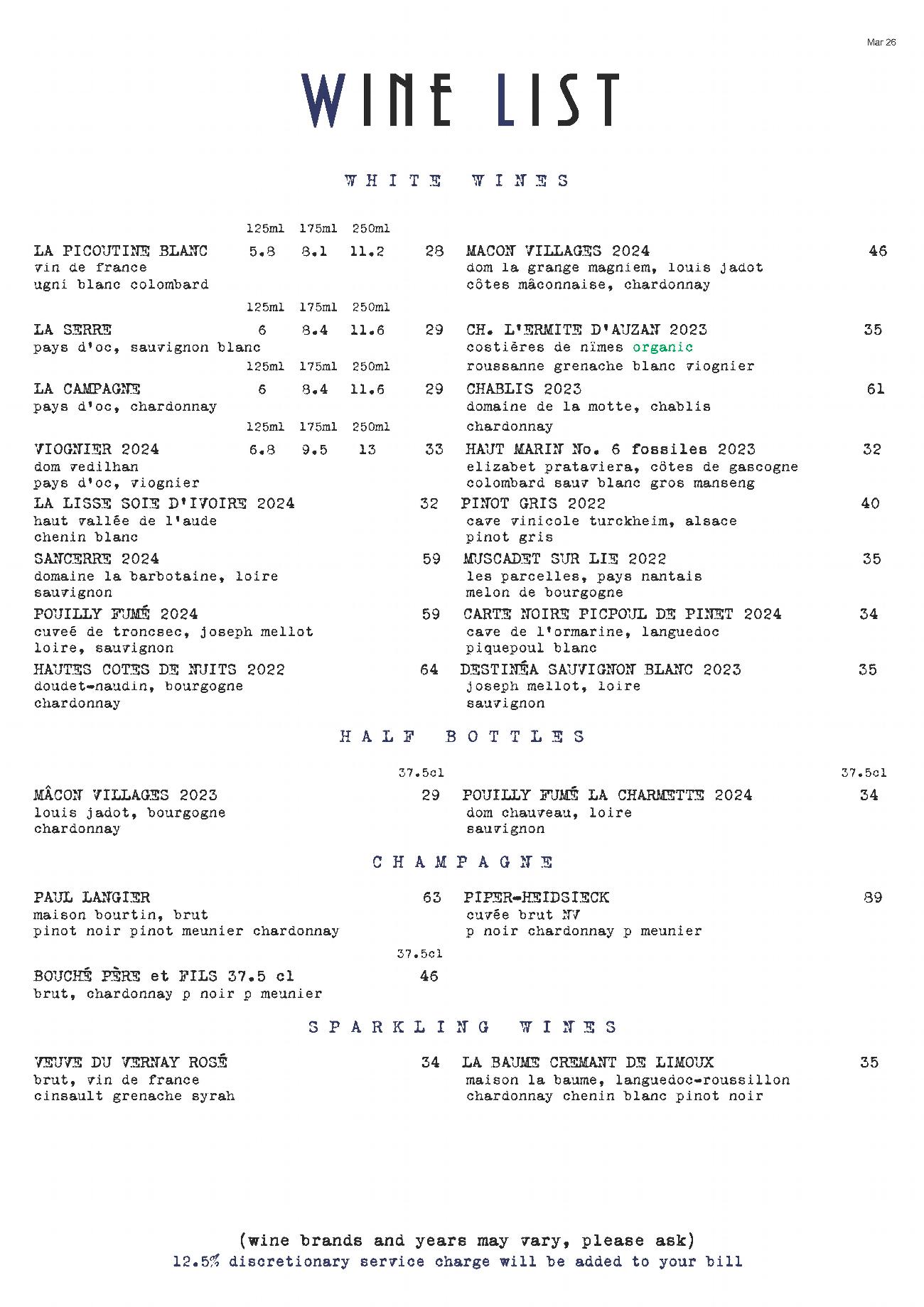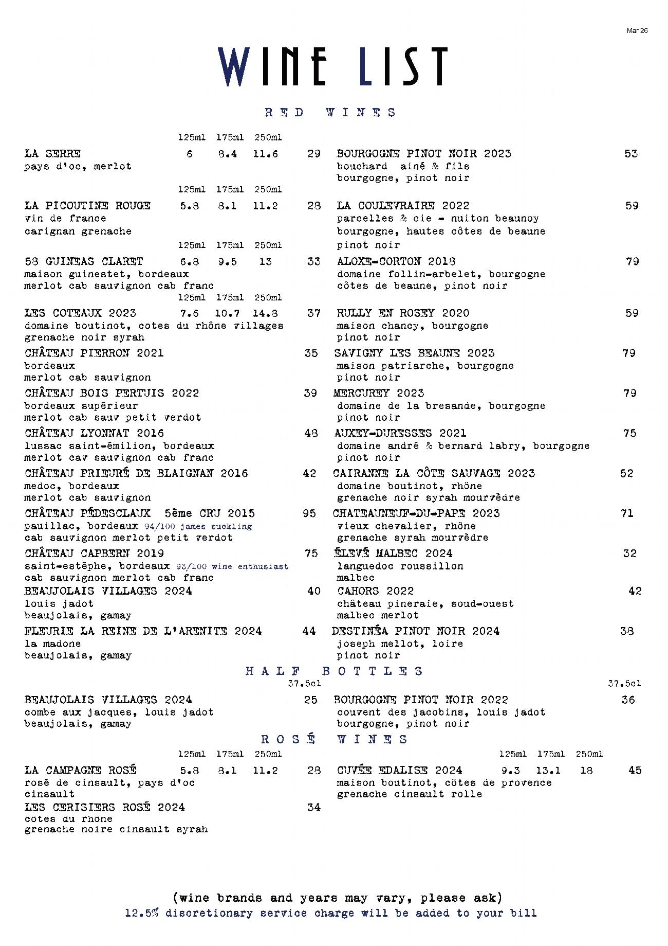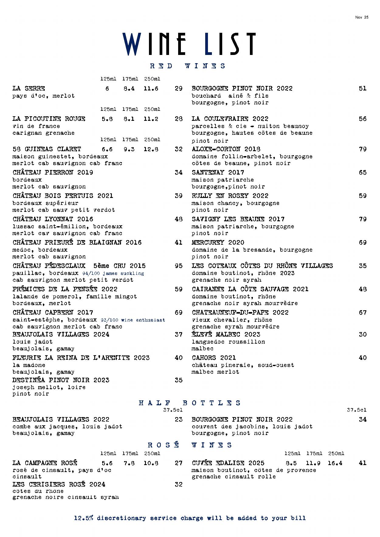 Our wine list here at L'Artiste Muscle is exclusively French. We go to great lengths to look for wines that offer excellent value and there are a number of interesting varieties from the Bordeaux region. Whether you're eating here at L'Artiste Muscle, or simply popping in for a drink, you'll find something for you at our wine bar.